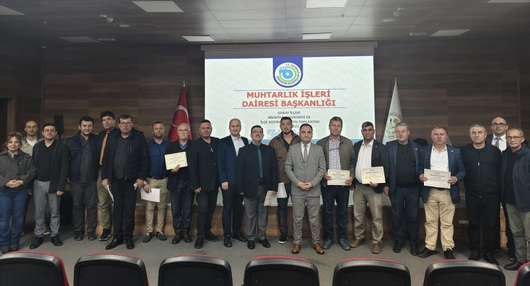 Saray Atatürk Kültür Merkezi'nde mahalle muhtarlarının yoğun katılımıyla gerçekleştirilen toplantıda, muhtarlara verimli bir eğitim verilirken, bölgede yaşanan sorunların yanı sıra talepler de masaya yatırıldı ve karşılıklı değerlendirmelerde bulunuldu.